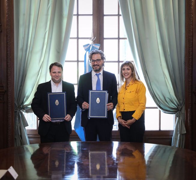 El canciller Santiago Cafiero; el vicepresidente en ejercicio de la Presidencia del INCAA, Nicolás Batlle, y la directora de Asuntos Culturales, Paula Vázquez, firmaron hoy en el Palacio San Martín el convenio marco entre el Instituto Nacional de Cine y Artes Audiovisuales (INCAA) y el Ministerio de Relaciones Exteriores, Comercio Internacional y Culto.